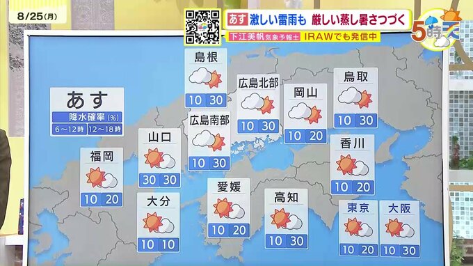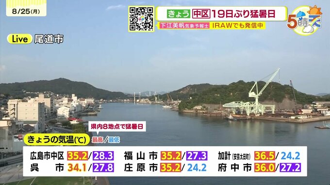 きょう25日(月)の広島県内は、晴れ間がありましたが、湿った空気が流れ込みやすく雲が日差しを遮る時間もありました。日中の最高気温は、加計で36.5℃を記録するなど、県内8地点で猛暑日を観測し、危険な暑さとなりました。広島市中区では19日ぶりに猛暑日復活となりました。おととい(土)は、24節気「処暑」にあたり、処暑を過ぎましたが暑さが収まる気配が全くありません。