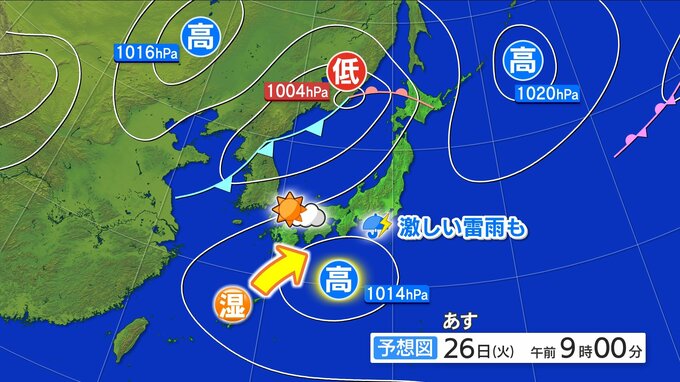 26日(火)晴れ間あり 北部ほど雲が広がりやすい 局地的に激しい雷雨の可能性も
