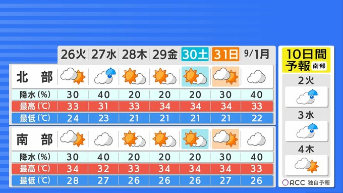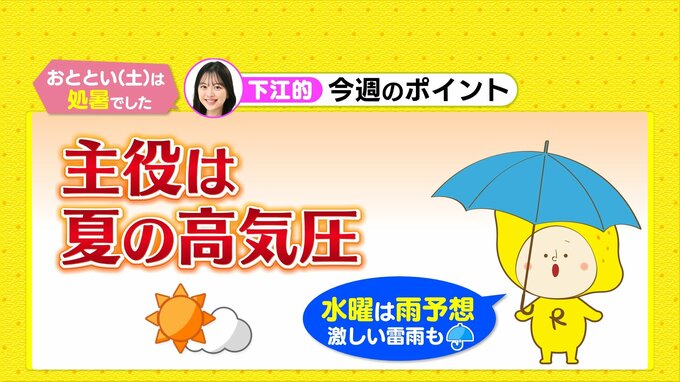 今週は、基本的には晴れる日が多いですが、高気圧の縁を回る湿った空気が流れ込みやすく、激しい雷雨になる地点もあるでしょう。あさっては、前線が南下する影響で雨が降る見込みです。日中の気温は35℃に迫る日が続き、厳しい蒸し暑さが続くでしょう。夏バテ対策は万全にしていきましょう。