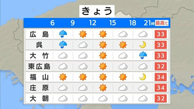 きょう28日(木)の広島県内の朝は、各地で日差しが届いています。最低気温は、広島市中区25.2℃、呉市25.4℃と、きのうよりも3℃ほど低くなりました。きのう夕方のまとまった雨で一気に気温が下がった影響です。一方、ほどんど雨が降らなかった北部では、きのうとほとんど変わらず、三次の最低気温は24.0℃でした。