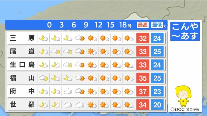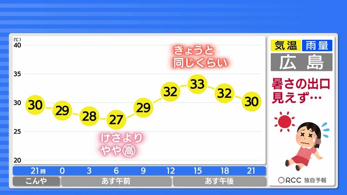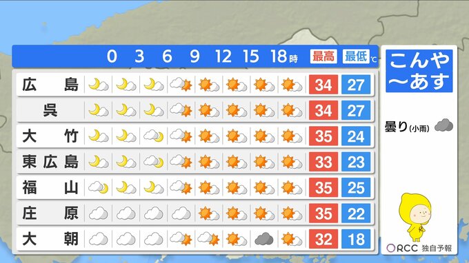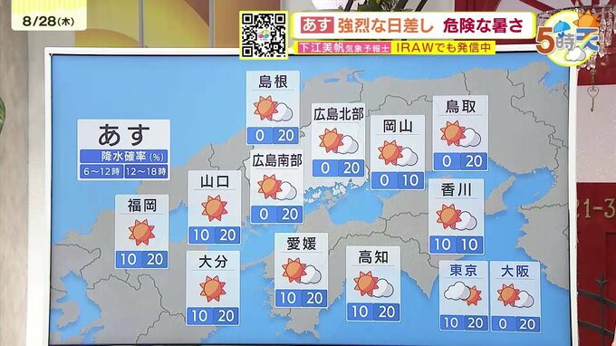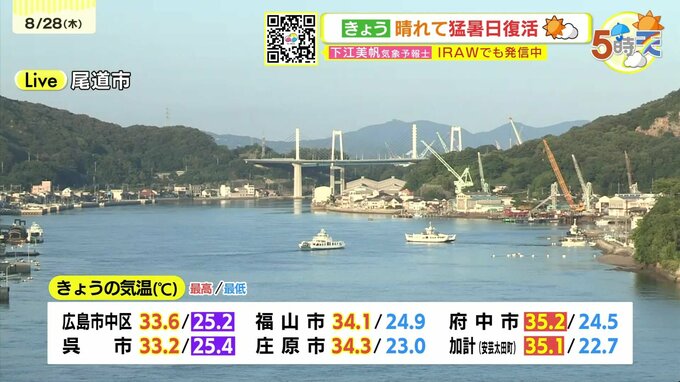 きょう28日(木)の広島県内は、おおむね晴れて気温が上昇しました。狭い範囲で局地的な雷雨の地点もありました。きょうの最高気温は、加計で35.1℃ 府中市で35.2℃ 猛暑日地点が復活しています。