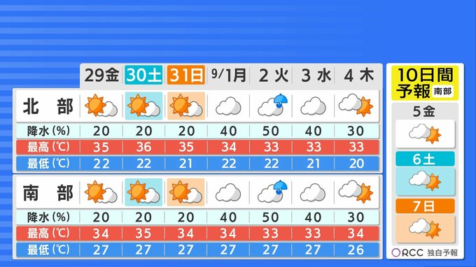 今週末にかけて高気圧の影響でおおむね晴れるでしょう。来週月曜日以降は、低気圧や前線が近づき、雲が優勢の天気で雨の降る時間がある予想です。日中の気温は35℃に迫る日が多く、今週末は猛暑日地点が多くなり、危険な暑さになる見込みです。8月も残りわずかですが、厳しい暑さはまだまだ長期戦になりそうです。