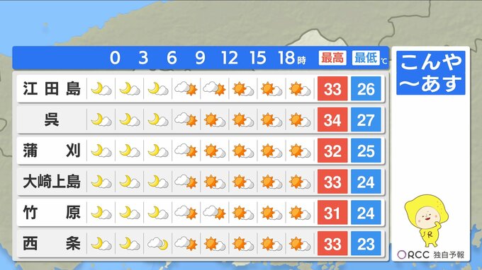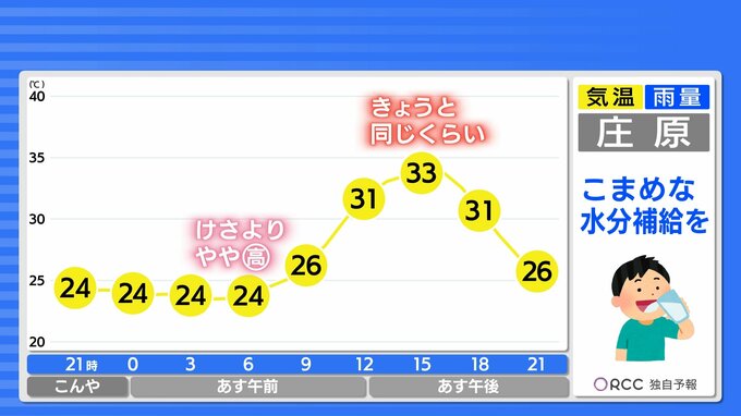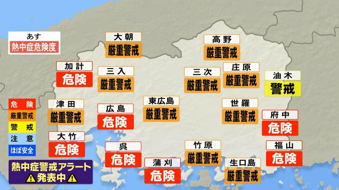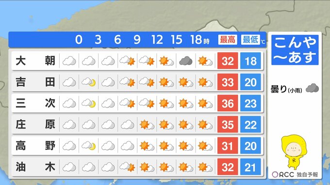 あすの予想最高気温は、内陸部を中心に36℃~37℃くらいまで上がる地点があり、危険な暑さになります。引き続き熱中症警戒アラートが継続発表中です。今一度暑さ対策の見直しをお願いします。