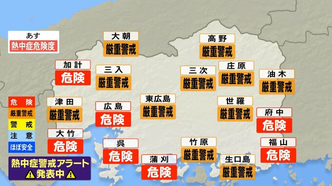 広島市中区では、6日(土)に26日ぶりに熱帯夜解消となりましたが、昨夜からけさにかけては再び熱帯夜となっています。あす朝にかけても最低気温は25℃を下回らない見込みです。夜間の熱中症にも気をつけてください。日中の気温は、沿岸部を中心にきょうよりやや高く、35℃に迫る地点が多いでしょう。北部ではきょうよりも5℃ほども高くなる地点がある見込みです。厳しい残暑が続くため、万全の熱中症対策が必要です。