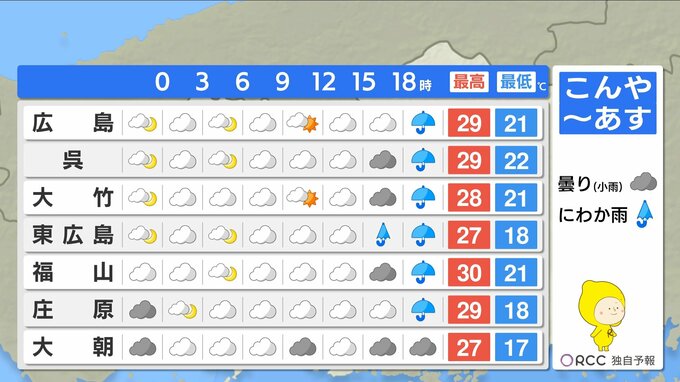 きょう23日(火)の広島県内は、朝から断続的に雨雲が流れ込み、雨が降ったりやんだりで、本降りの時間帯もありました。夕方以降は、次第に雨は小康状態になりました。きょうの最高気温は全地点で25℃を下回り、特に昼間は各地20℃前後で、涼しいひんやりとした一日になりました。