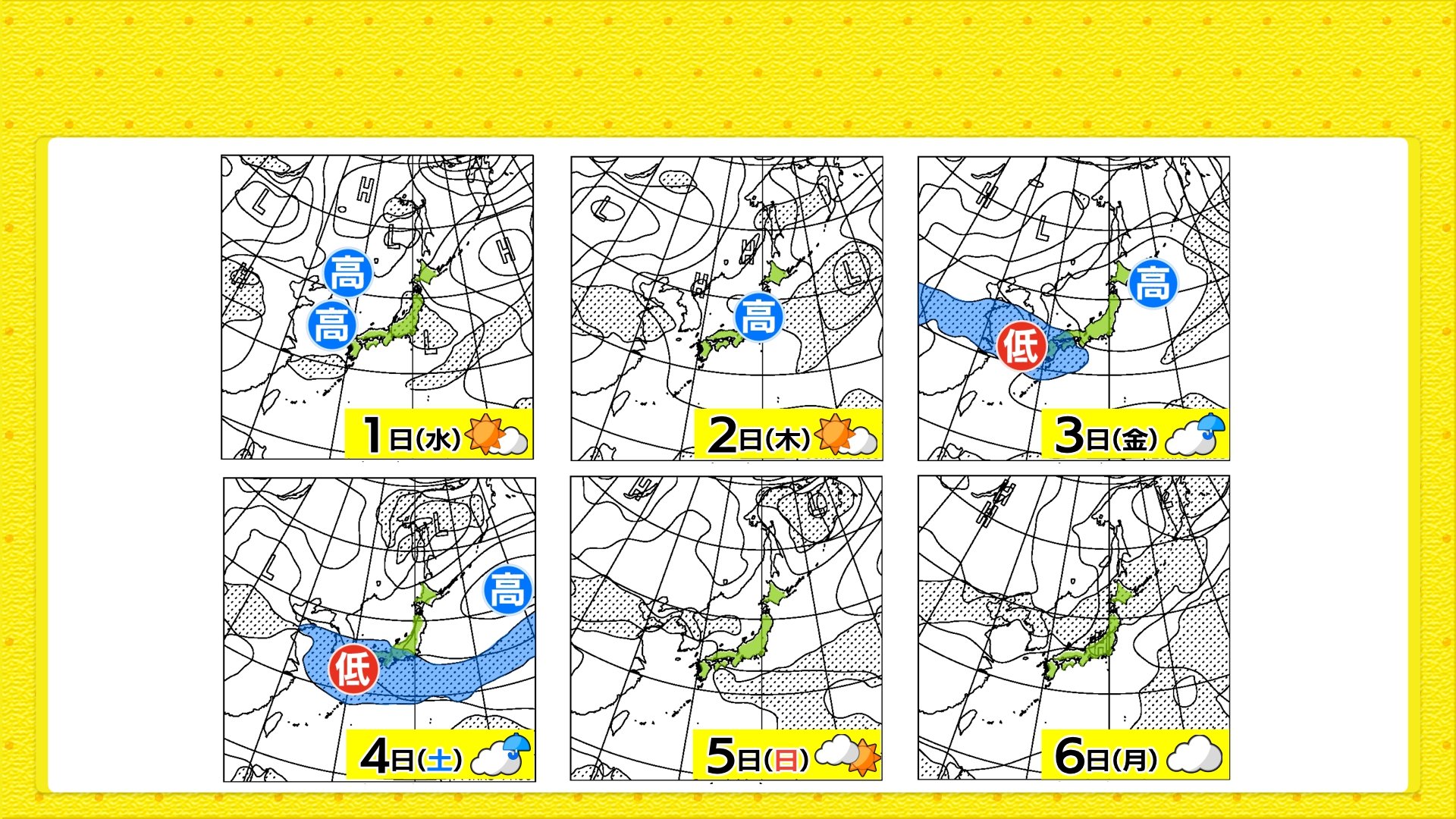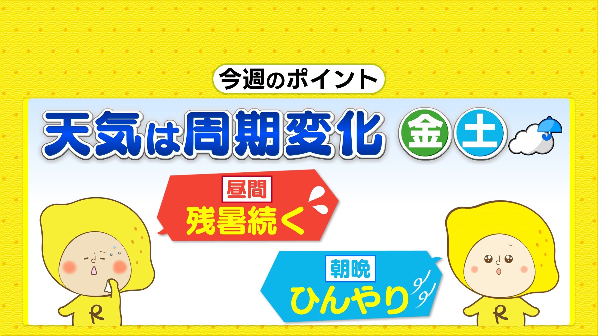 今週も引き続き天気は周期変化します。木曜日にかけては秋の高気圧の影響で秋晴れが続き、カラッとした陽気になるでしょう。金曜日から土曜日にかけて、前線や低気圧が近づきすっきりせず、雨が降る見込みです。最高気温は、28℃前後で残暑続きますが、朝晩は北部を中心に冬のような寒さになる日も多くなりそうです。寒暖差がかなり大きくなるので重ね着をしっかりしていただき、くれぐれも体調管理にはご注意ください。