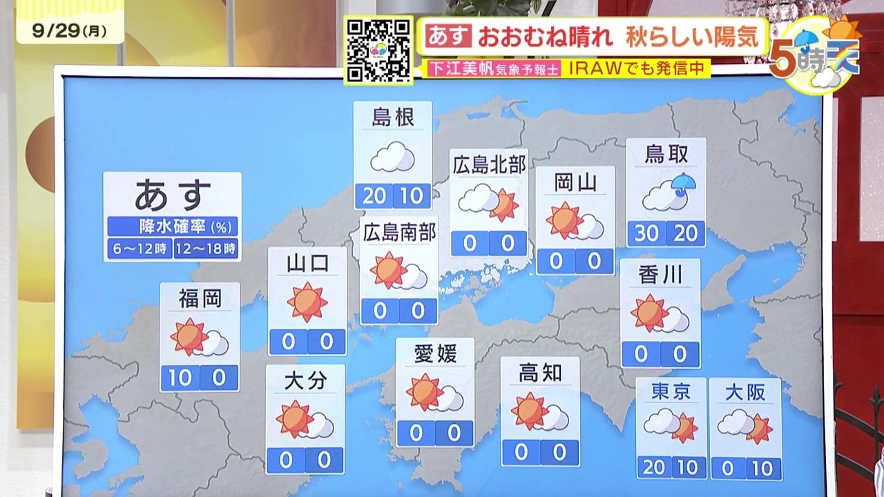 あすは、秋の高気圧の影響でおおむね晴れるでしょう。きょうよりも湿度が低めでカラッとした陽気になりそうです。にわか雨の可能性も低いでしょう。