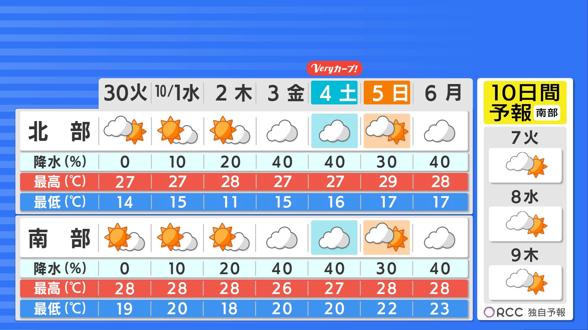 最低気温は、北部では15℃を下回る地点が多い予想で、かなり冷えますので厚手の長袖をご用意ください。南部でも20℃を下回る地点が多く、肌寒く感じられるでしょう。重ね着をしっかりしてお過ごしください。最高気温は、おおむね平年並みから平年よりやや高いでしょう。