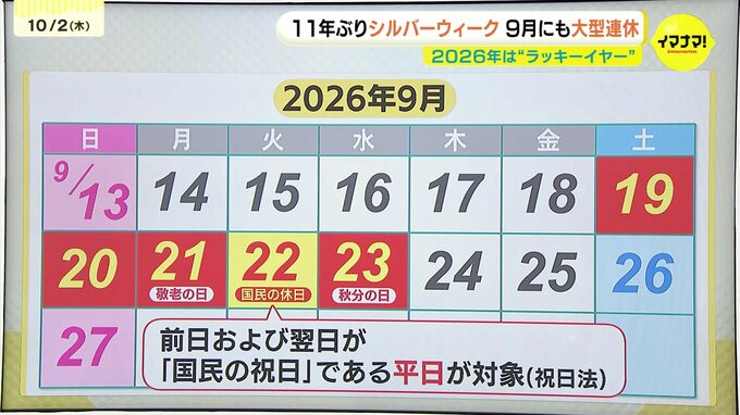 一方、2026年9月は「国民の祝日に関する法律」に基づき、祝日(21日の敬老の日)と祝日(23日の秋分の日)の間に挟まれ22日が「国民の休日」として休日に切り替わります。これにより、土曜日から水曜日までの最大5連休のシルバーウィークが出現することになります。