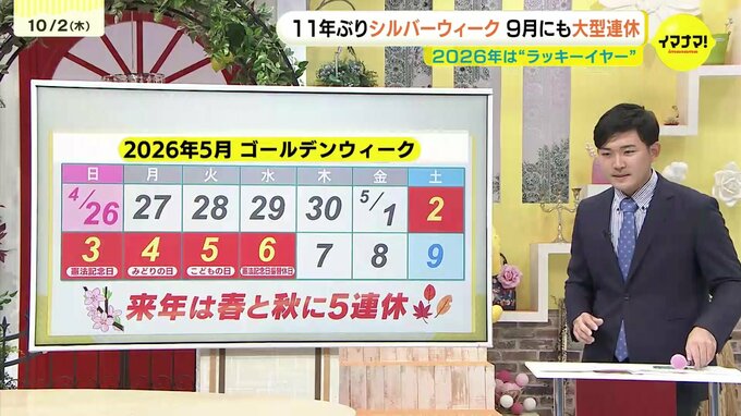 シルバーウィークの復活だけでなく、来年2026年は春のゴールデンウィークもカレンダーの並びが良く、5連休となります。2025年のGWが4連休だったことを考えると、2026年は春と秋に5連休がやってくる、非常に恵まれた年だと言えます。