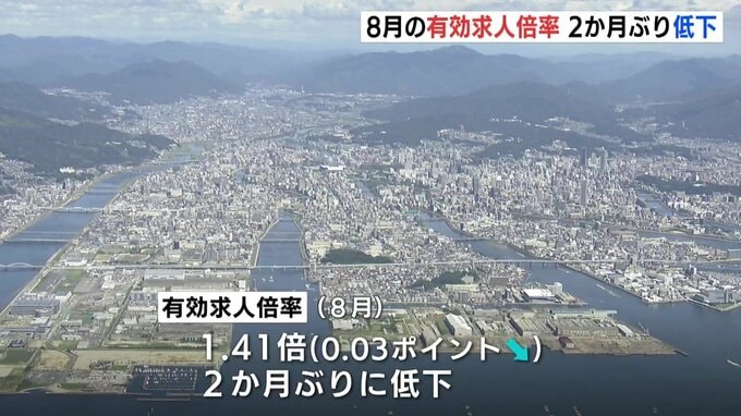 広島労働局によりますと、8月の県内の有効求人倍率は1・41倍で、前の月を0・03ポイント下回り2か月ぶりの低下となりました。