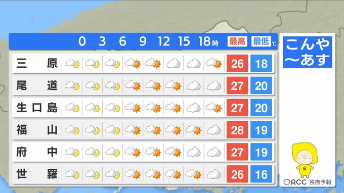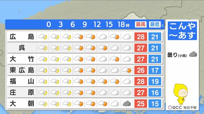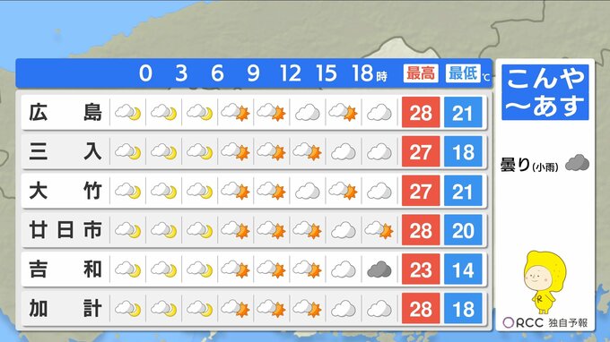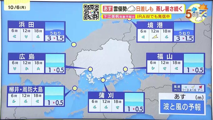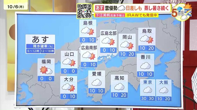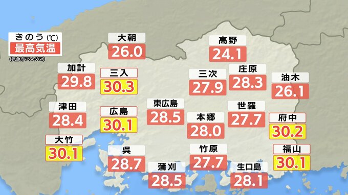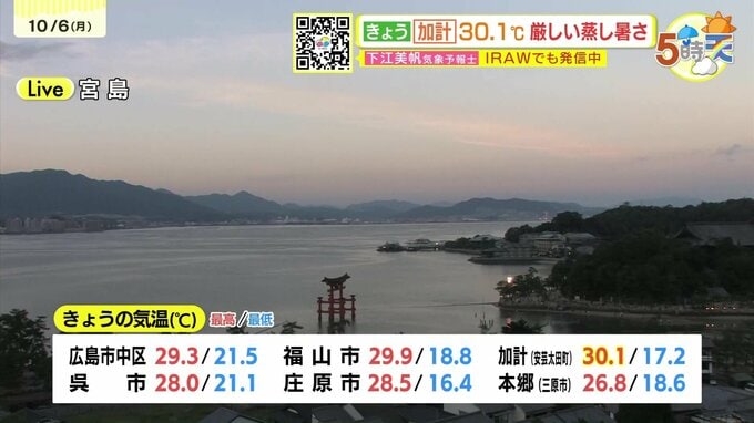 きょう10月6日(月)の広島県内は、朝から日差しがよく届き、蒸し暑い一日になりました。最高気温は、加計で30℃を超え、広島市中区では29.3℃を記録するなど厳しい残暑が続いています。