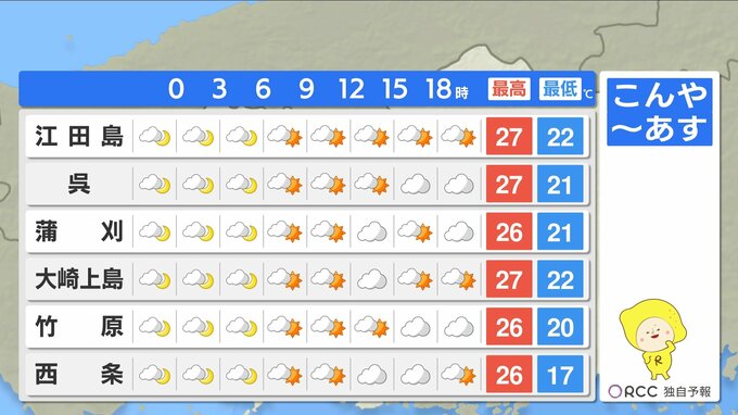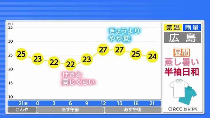 あす朝にかけても沿岸部を中心に気温が下がりにくく、少し寝苦しく感じるかもしれません。日中の気温は、きょうと比べるとやや低くなりますが、高気圧の縁を回る湿った空気や台風由来の湿った空気が流れ込みやすくなり、あすも湿度が高くなります。蒸し暑い一日になりそうです。
