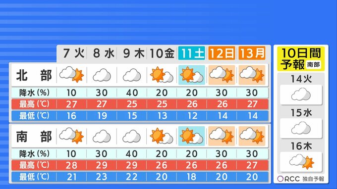 水曜日と木曜日はすっきりせず、金曜日以降は再び晴れるでしょう。最高気温は、木曜日にかけて28℃前後の地点が多く、湿度が高く蒸し暑くなるでしょう。10月に入っていますが、残暑はもうしばらく続きそうです。朝晩の気温は木曜日頃にかけて下がりにくく、沿岸部を中心に寝苦しさを感じるかもしれません。服装選びが難しくなりますが、ご自身の体調に合わせて調節をしてください。