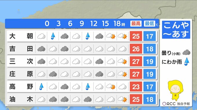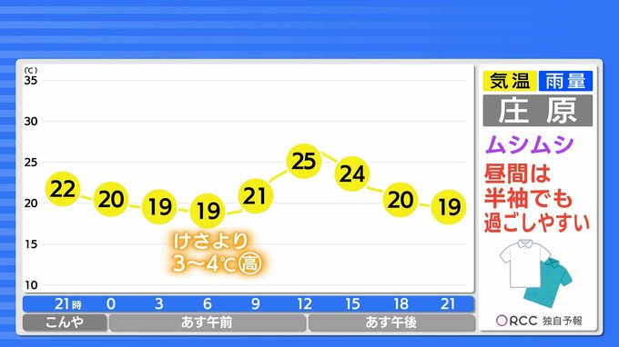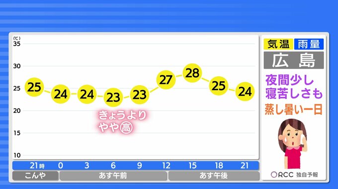 こんやからあす朝にかけて、気温が下がりにくく、沿岸部を中心に寝苦しく感じるかもしれません。北部や内陸部でも平年よりかなり高い気温になる見込みです。最高気温は、きょうと同じくらい~やや低くなるでしょう。ただ、台風由来の暖かく湿った空気の影響もあり、あすも蒸し暑い一日になるでしょう。
