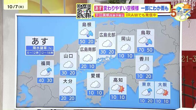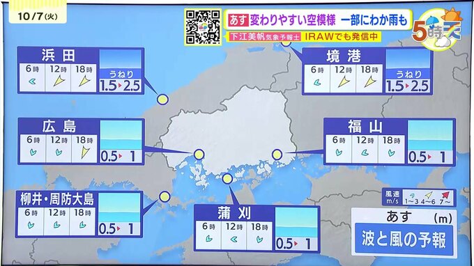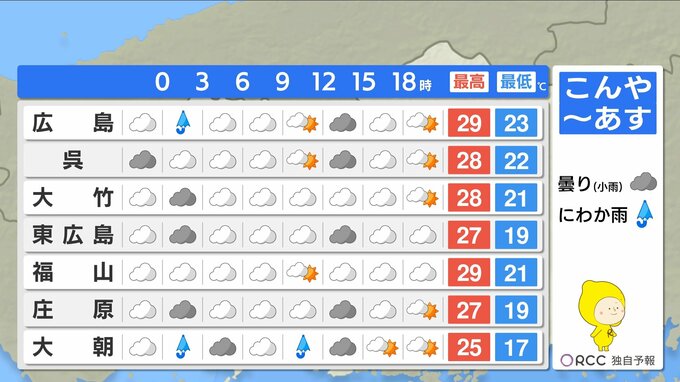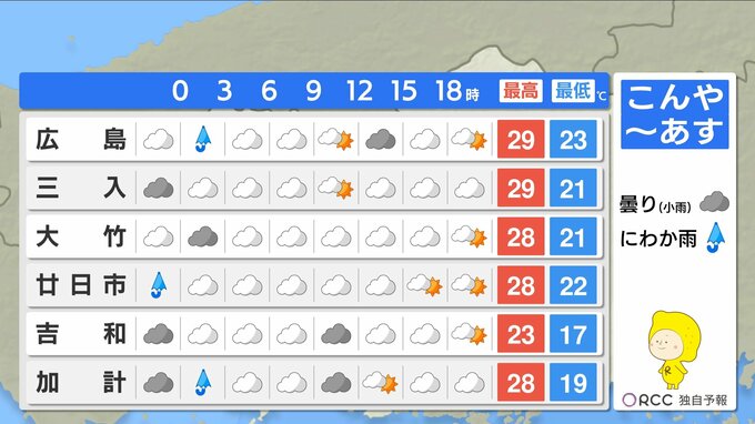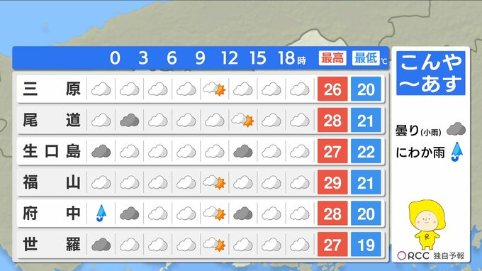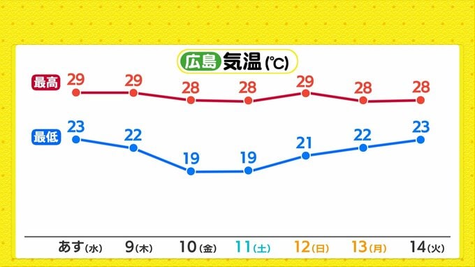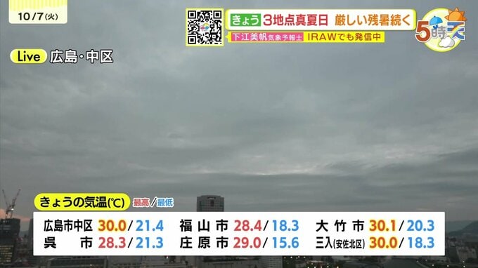 きょう7日(火)の広島県内は、おおむね晴れましたが、夕方頃からは徐々に雲が多くなりました。最高気温は、広島市中区で30.0℃など、県内3地点で真夏日を記録し、残暑が続いています。