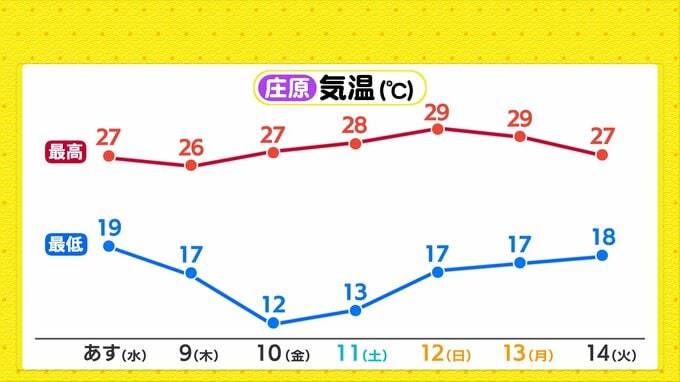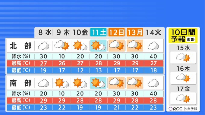 あさって以降しばらくおおむね晴れる日が続くでしょう。木曜日以降は湿度が低くなり、カラッとした暑さになりそうです。最高気温は28℃前後の日が多く、残暑は厳しい見込みです。最低気温も平年より高い傾向が続きますが、北部では金曜日~土曜日が12℃から13℃の予想です。平年よりは高いですが、短い期間に気温変化が大きく、一日の寒暖差も大きくなるため、体調管理を崩さないようご注意ください。