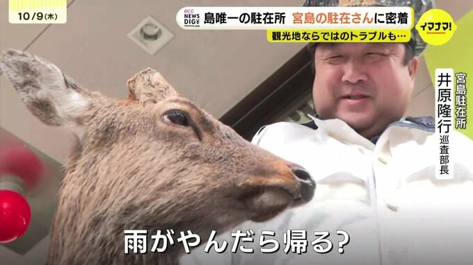 「雨がやんだら帰る?」宮島唯一の駐在所で雨宿りしているのはシカです。宮島のシンボルも思わず寄りたくなる駐在所。勤務するのは所長の大原正光警部補と井原隆行巡査部長です。