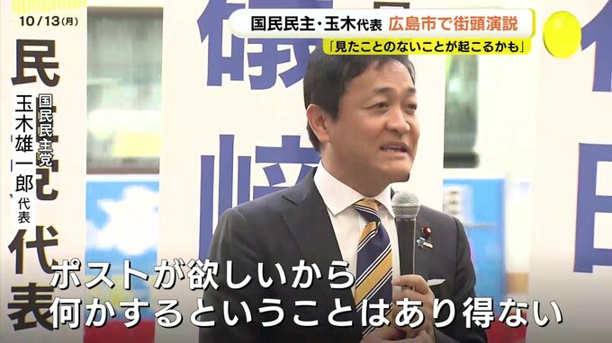 広島市を訪れたのは、国民民主党の玉木代表です。総理指名選挙での野党統一候補も取り沙汰される玉木氏の演説に多くの聴衆が詰めかけ、耳を傾けていました。