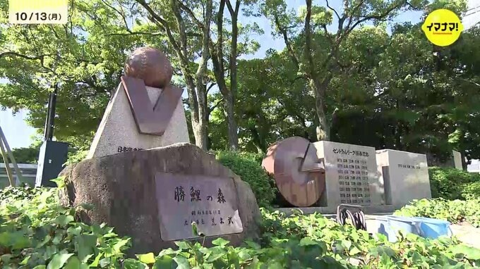 旧市民球場跡地にある「勝鯉の森」には、カープの優勝の記録が刻まれた記念碑が建てられています。