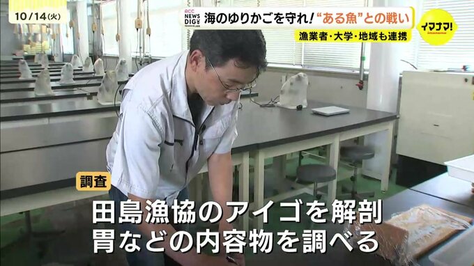 調査に使うのは田島漁協が捕獲したアイゴ。解剖し、胃などの内容物に海藻が入っているかを調べます。