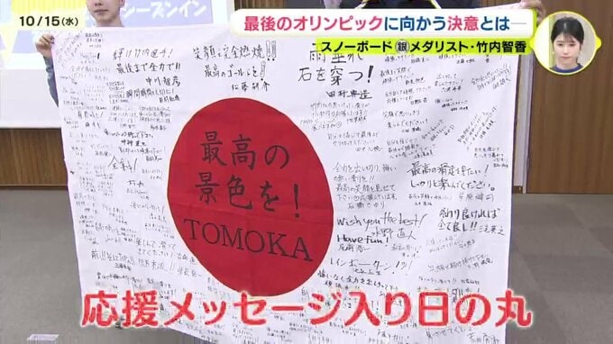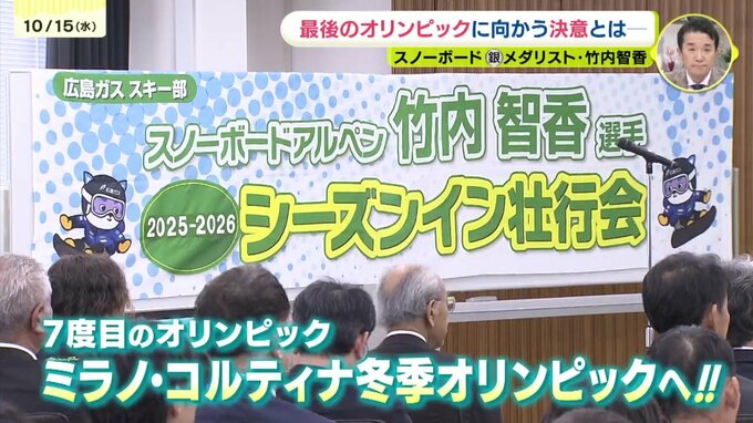 来年のオリンピックでの現役引退を表明した女子スノーボード竹内智香の壮行会が開かれました。女子で史上最多7度目のオリンピック出場に向けて竹内が抱負を語りました。