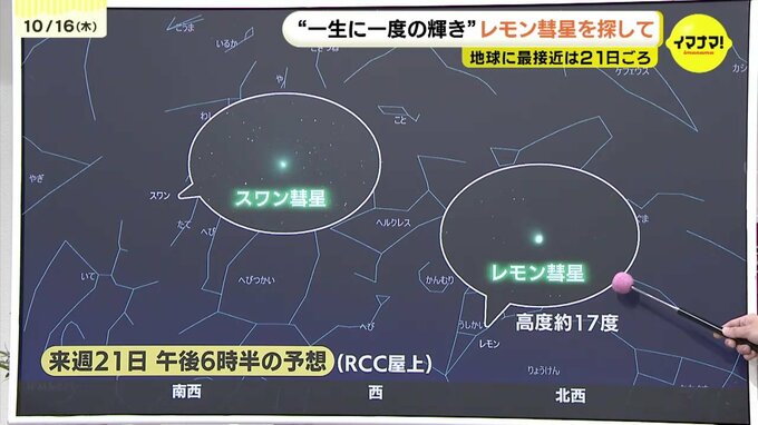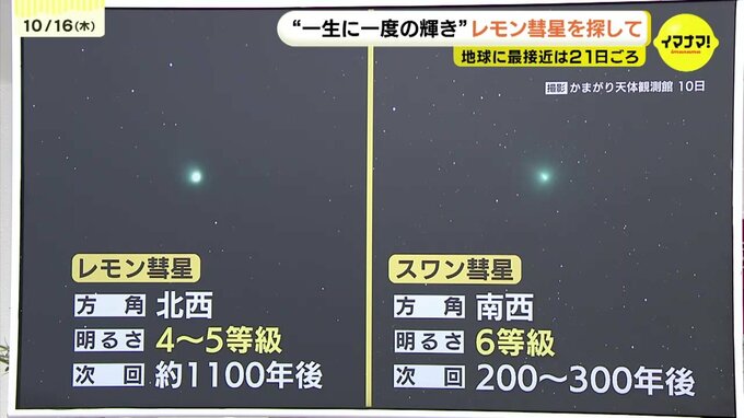 明るさは6等級で南西の空に見られます。レモン彗星の最大4等級と比べると、等級が2つ違うため、明るさは約6倍も、レモン彗星の方が明るいことになります。条件さえ揃えば、レモン彗星の方が見つけやすいと言えそうです。スワン彗星が次に訪れるのは200〜300年後で、貴重な天体です。