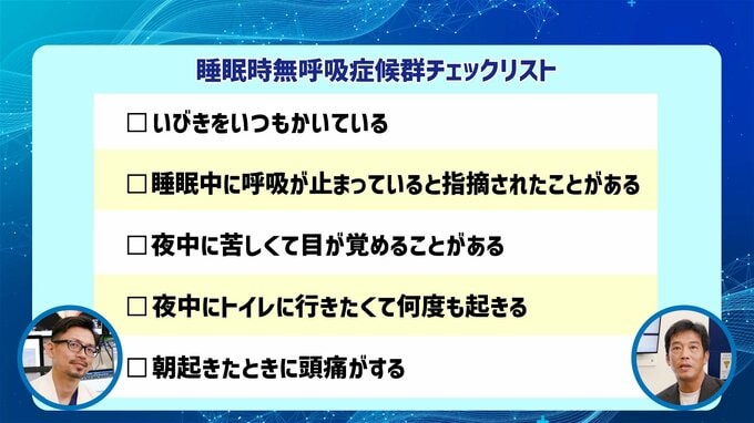 中村医師「一つでも当てはまる項目があれば、睡眠時無呼吸症候群の可能性があります。注意が必要です。眠りの乱れが血圧や心臓、血糖など、さまざまな不調の”出発点”になっていることもあります。放置せず、早めに医療機関に相談してください。」