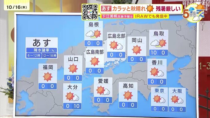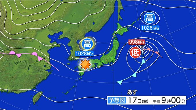 雨を降らせた低気圧や前線は本州から遠ざかり、秋の高気圧に覆われ秋晴れの空が広がるでしょう。湿度が低くカラッとした陽気になりそうです。洗濯物はよく乾きそうです。日差しが強いですので紫外線対策はしっかりしてお過ごしください。
