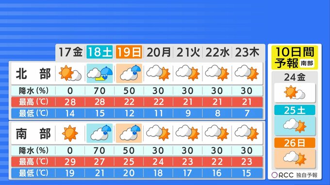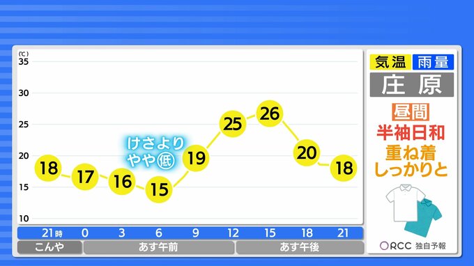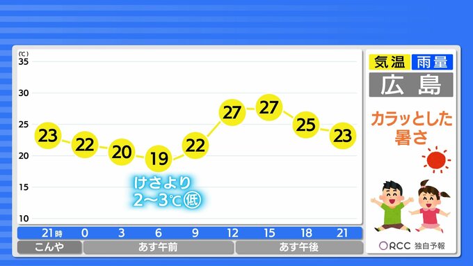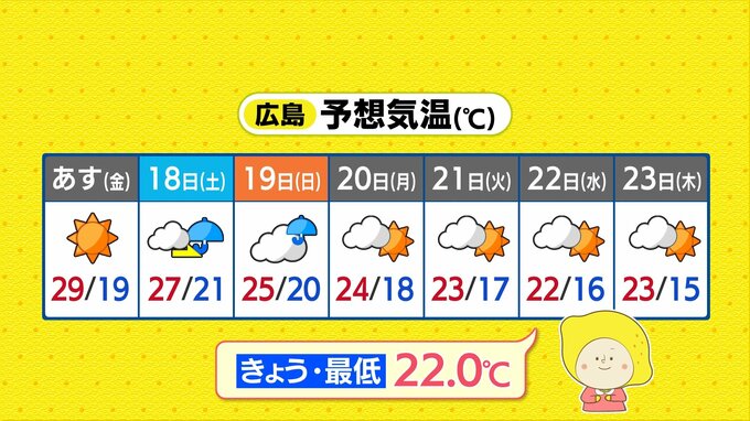 最低気温は、北部や内陸部で各地15℃を下回り、沿岸部でも20℃を下回る地点が多いでしょう。けさより2℃~3℃低くなる地点が多く、涼しくなります。寝ている間に風邪を引かないようご注意ください。最高気温は30℃に迫る地点が多く、真夏日を記録する地点があるかもしれません。湿度が低く、カラッとした暑さになりそうです。できるだけ直射日光を避けながらお過ごしください。