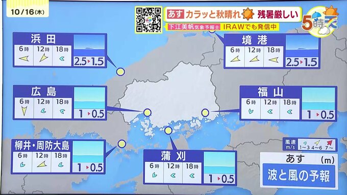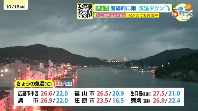 きょう16日(木)の広島県内は、午前中から断続的に雨が降り、午後を中心に降り方が強まった地点がありました。最高気温は、広島市中区で26.6℃ 福山で26.5℃など、きのうより低くなりジメジメとした一日でした。