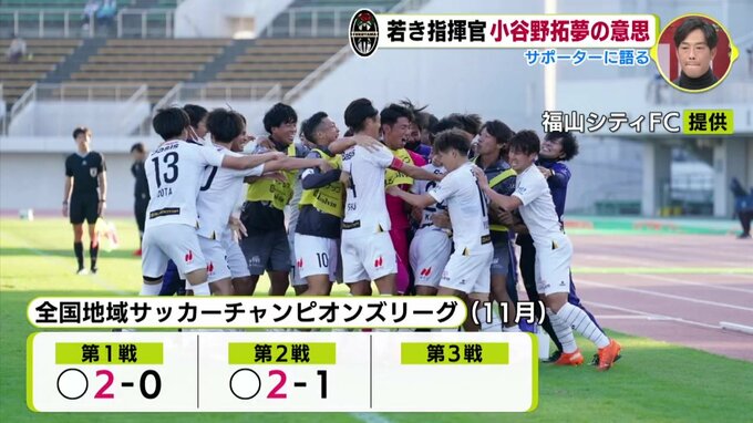 社会人サッカークラブの福山シティFCが12月3日(土曜日)ファン感謝祭を開き、3年間率いた24歳の小谷野拓夢(こやの・ひろむ)監督がチームを離れる思いをサポーターの前で語りました。