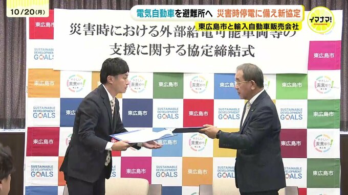 災害時の停電に備えて、東広島市と輸入自動車販売会社が電気自動車を避難所に貸し出す新たな協定を結びました。