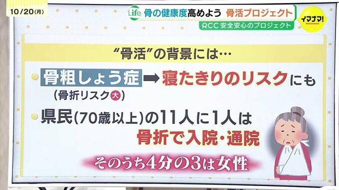 そんな中、広島県民の70歳以上の11人に1人は骨折で入院・通院していて、そのうち3/4は女性だということです。