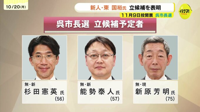 呉市長選にはいずれも無所属で、元総務省官僚の杉田憲英氏、元国会議員秘書の能勢泰人、現職の新原芳明氏が、立候補を表明しています。