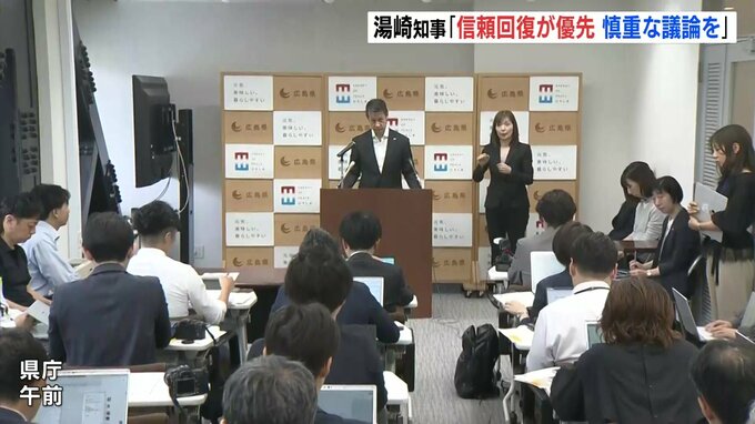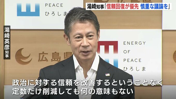 自民党と日本維新の会が合意した国会議員の定数削減を目指す方針について、広島県の湯崎知事は21日、政治に対する信頼回復が優先だとして慎重な議論を求めました。