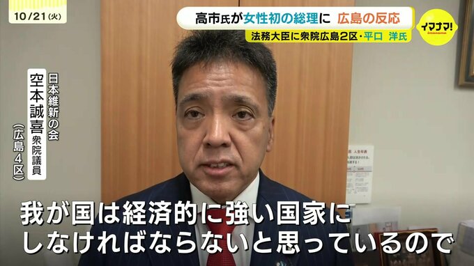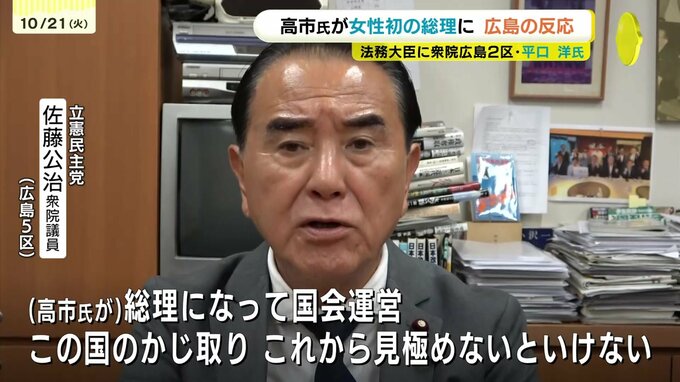 臨時国会が召集され、日本維新の会と連立で合意した自民党の高市総裁が21日、女性初となる総理大臣に指名されました。新しい内閣では、衆院広島2区選出の平口洋氏の法務大臣への起用が決まっています。