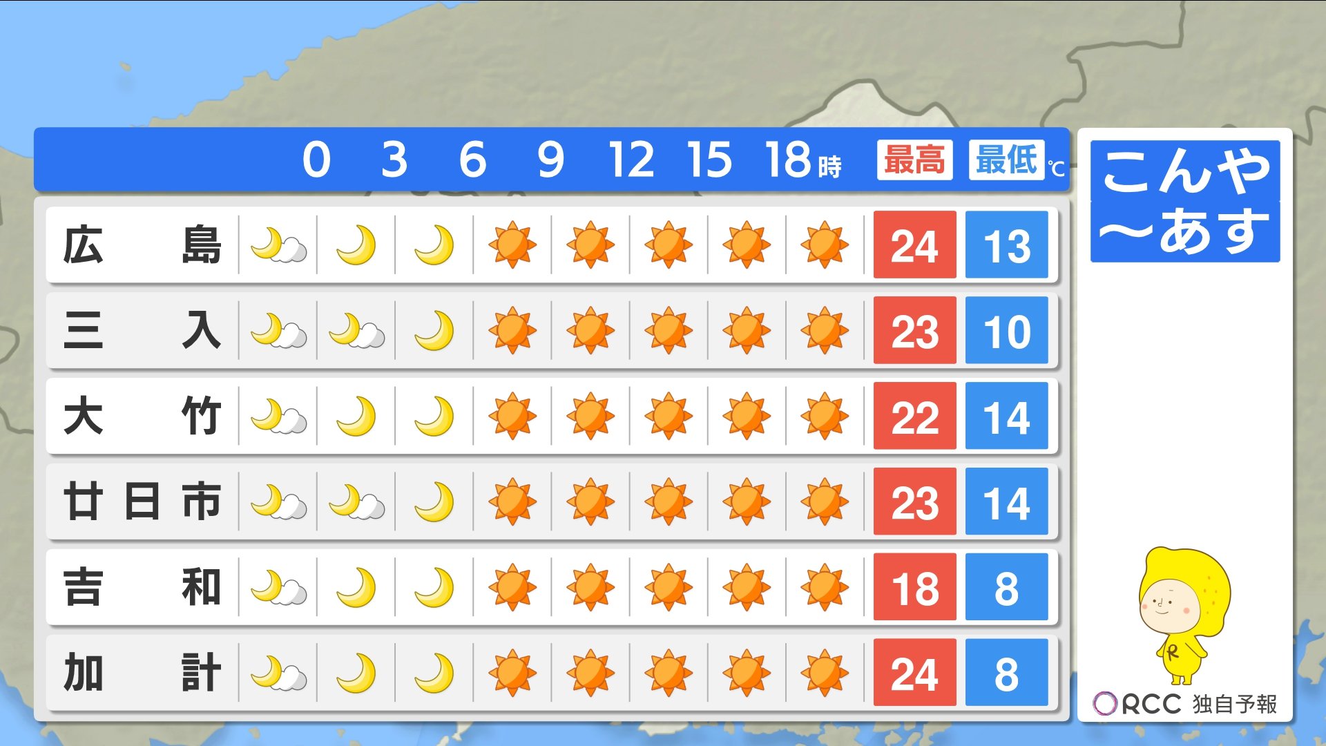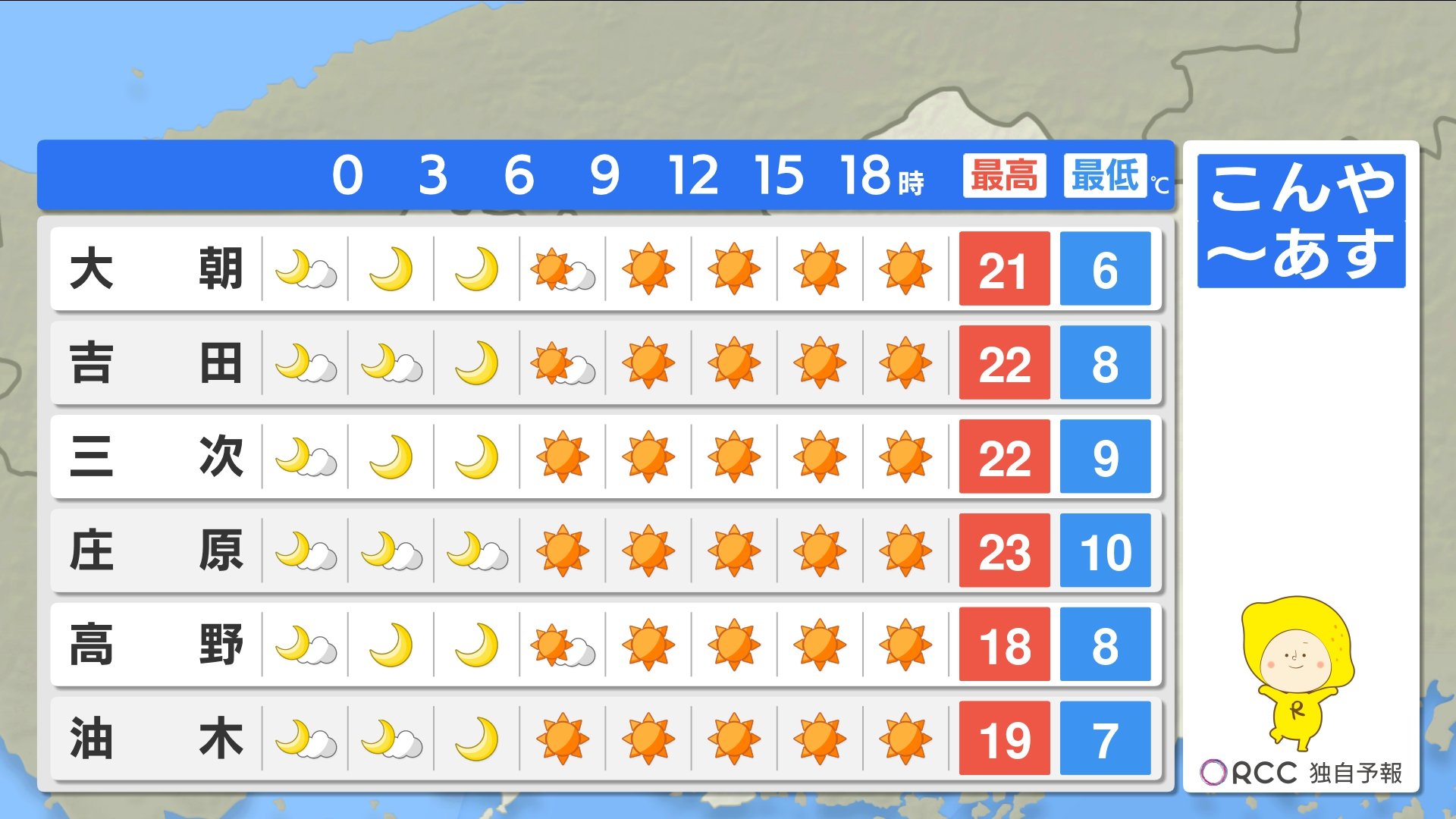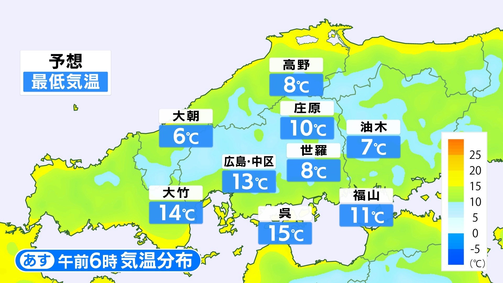 こんや~あす朝にかけてさらに冷え込みが強まります。最低気温は、北部内陸部では1ケタの地点が多い予想です。沿岸部でも15℃を下回る地点が多いでしょう。かなり冷えますので、こんや寝る時の服装にご注意ください。最高気温は各地で20℃を超え、あすは日差しの暖かさを感じられそうです。