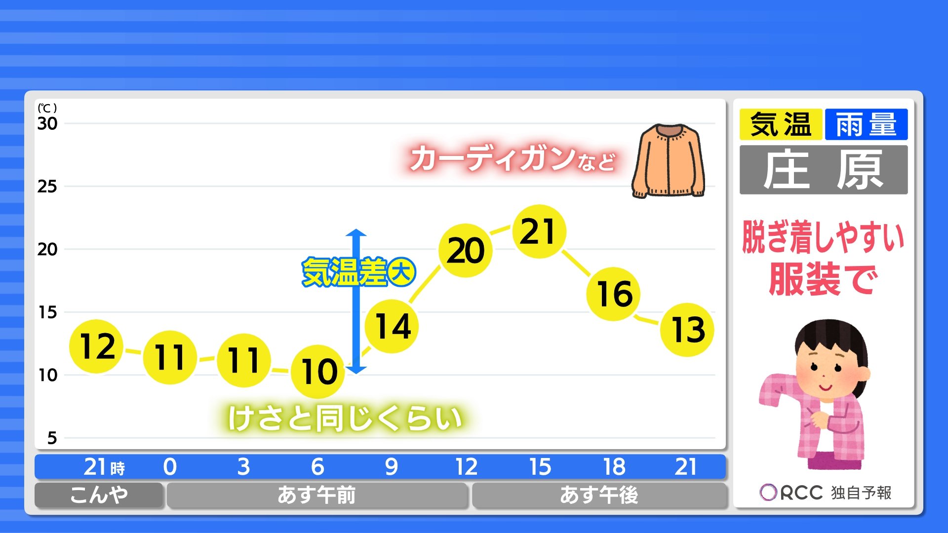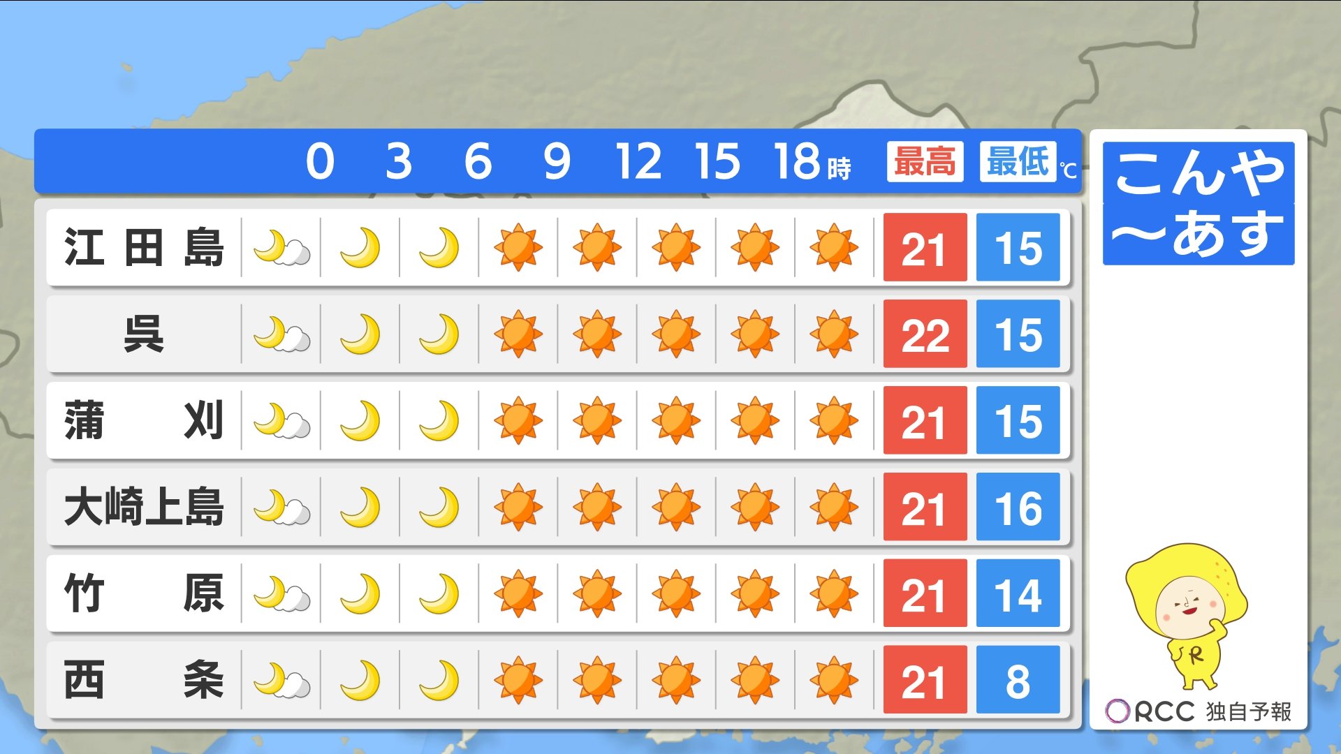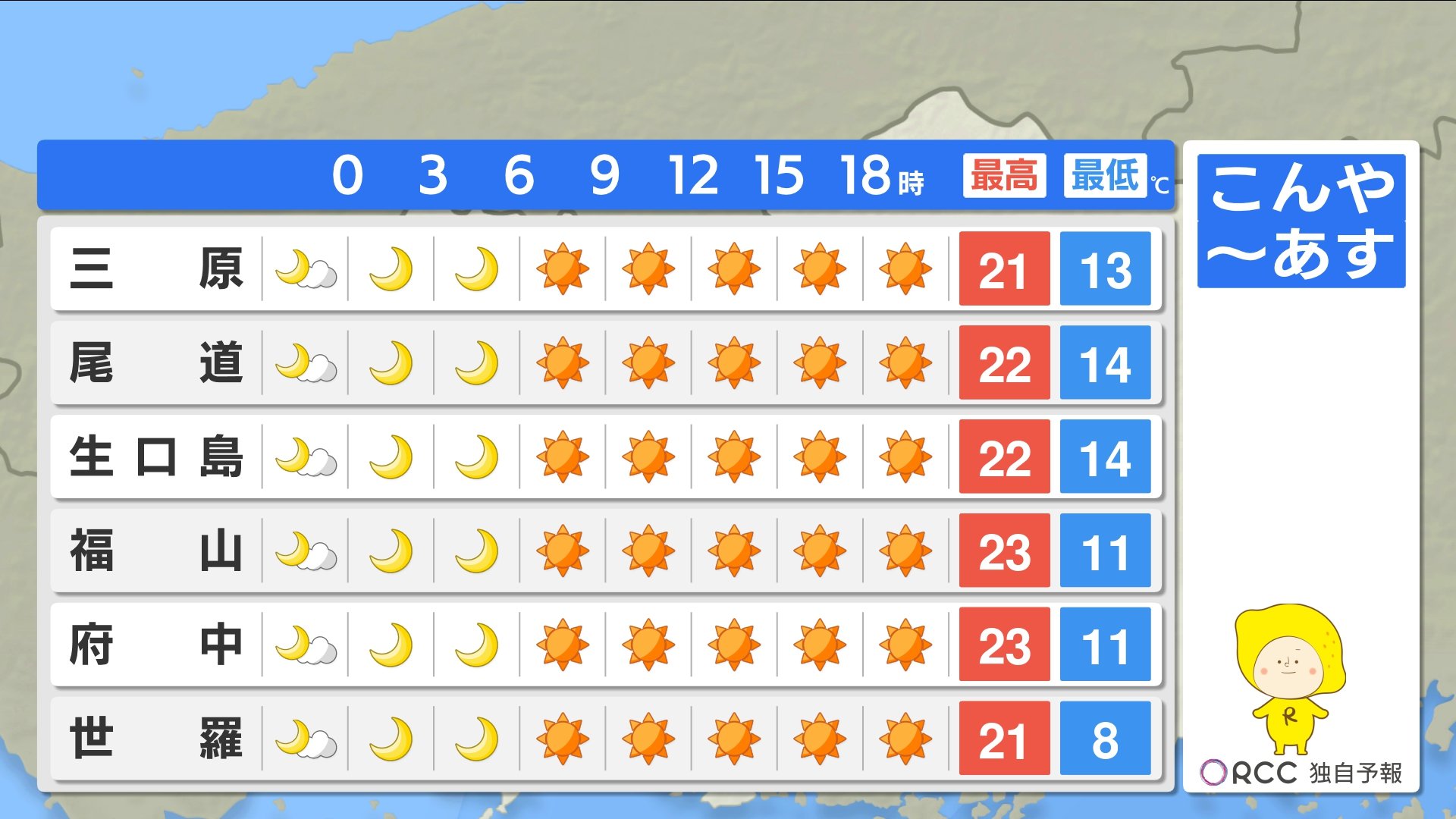 こんや~あす朝にかけてさらに冷え込みが強まります。最低気温は、北部内陸部では1ケタの地点が多い予想です。沿岸部でも15℃を下回る地点が多いでしょう。かなり冷えますので、こんや寝る時の服装にご注意ください。最高気温は各地で20℃を超え、あすは日差しの暖かさを感じられそうです。