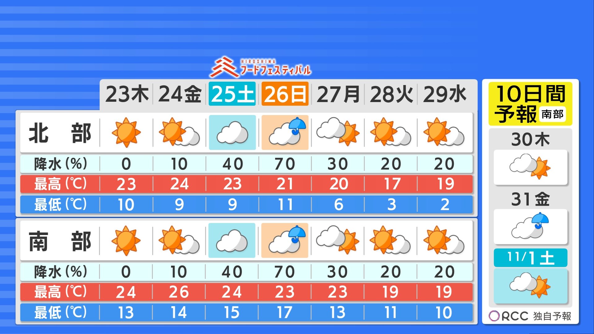 あさってまでおおむね晴れるでしょう。週末はすっきりしない予想で、雨が降りやすくなる見込みです。最高気温は、あす以降連日20℃を超え、日中は暖かくなりますが朝晩はぐっと気温が下がりますので服装選びは慎重になさってください。来週になると朝晩の冷え込みはさらに強まるでしょう。