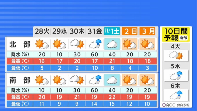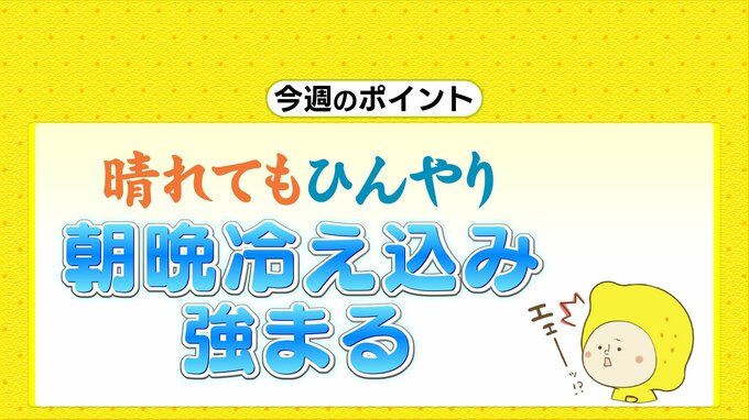 この先、木曜ごろまでは晴れますが、金曜と土曜はぐずつく見込みです。これからの時期、晴れると放射冷却が効いて冷え込みが強まります。特に水曜と木曜は、北部や内陸で霜が降りるような気温になりますので、農作物の管理にご注意ください。