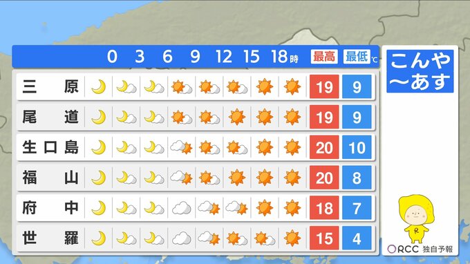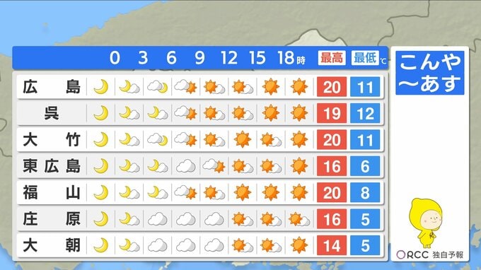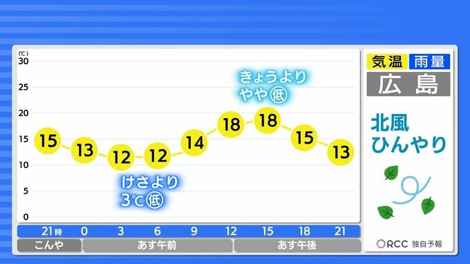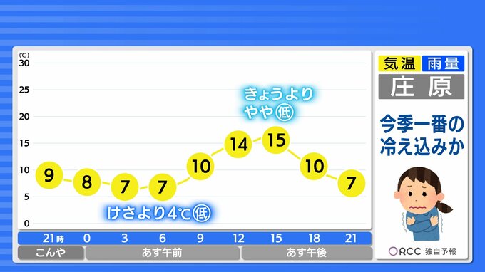 日中、日差しが届いても20℃を下回るところが多く、朝はきょうよりも3~4℃低くなるでしょう。今季1番の冷え込みのところが多い見込みです。