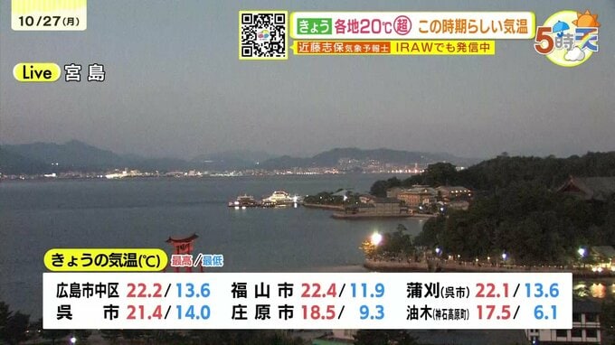 きょう27日(月)の広島県内は、よく晴れて20℃を超えたところが多くなりましたが、北風がひんやりと感じられました。最高気温は広島市中区22.2℃、福山市22.4℃、庄原市18.5℃でした。