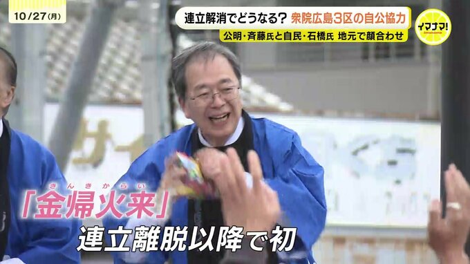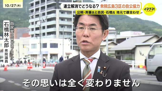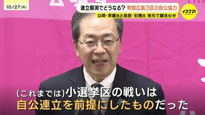 2人の地元・衆院広島3区では、公明党の斉藤代表が過去2回に渡って「与党統一候補」として選出。自民党の石橋議員は、選挙区を公明党に譲り、比例代表に回っています。連立解消を受け、次の衆院選で広島3区は、これまでどおり自民・公明の選挙協力が実現するのかどうかに注目が集まっています。