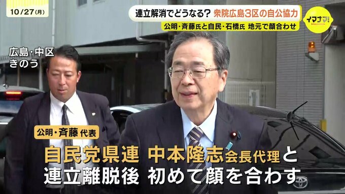 広島3区をめぐっては「地元での協議」を強調した斉藤代表。26日、広島市内で自民党県連の中本隆志会長代理と連立離脱後、初めて顔を合わせました。