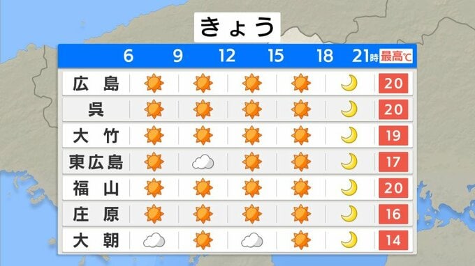 けさ(28日朝)の広島県内は、薄雲が広がる程度で、天気の崩れはありません。最低気温は、広島市中区10.0℃・福山市7.5℃。北部では、庄原市4.4℃・神石高原町油木2.7℃など、県内ほとんどの地点で今シーズン最も低い気温となりました。11月上旬~中旬並みの体感です。
