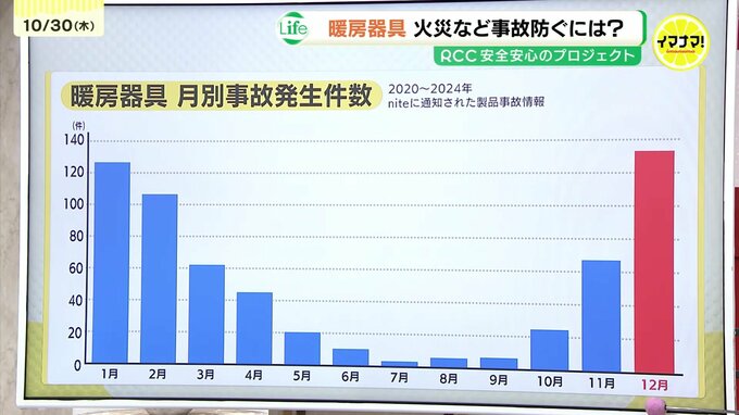 製品評価技術基盤機構「NITE」によると、暖房器具の月別の事故発生件数は、11月以降に増え、12月がピークとなります。シーズンの暖房器具を使い始める時期であるため、増加するようです。