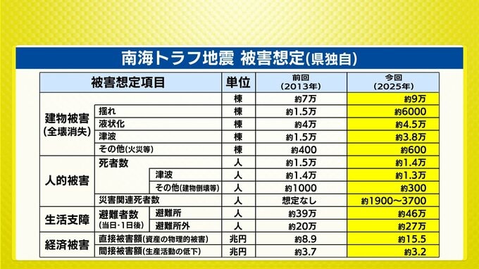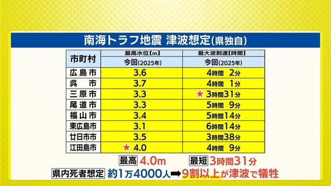 続いて津波に関する想定です。最高水位は江田島市で最大4m。最大波の到達時間は、三原市で最短3時間31分などとされています。死者は1万4000人で、9割以上が津波で犠牲になると考えられています。