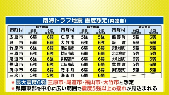 広島県が31日に公表した南海トラフ地震の想定震度です。県内では三原市・尾道市・福山市・大竹市で、「最大震度6強」と想定されています。県南東部の広い範囲で震度5強以上の揺れが見込まれています。