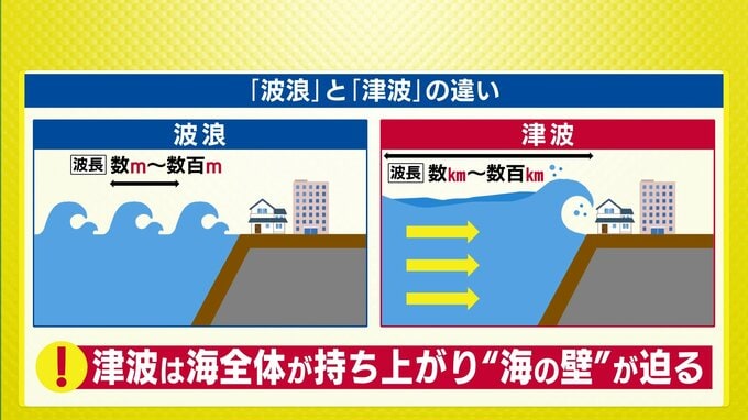 「波浪」と「津波」の違いをイメージでまとめました。波浪が海面付近の海水が移動するのに対し、津波は海底から海面まで海水全体が押し寄せてきます。